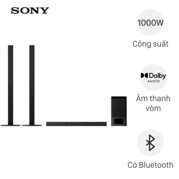 - Dàn âm thanh Sony này được thiết kế hệ thống âm thanh 5.1 kênh, gồm có 1 loa soundbar (thanh ngang), 1 loa sub và 2 loa sau, cho chất lượng âm thanh mạnh mẽ như trong rạp chiếu phim.