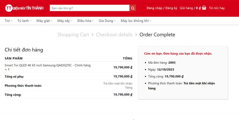 Hoàn tất các thủ tục trong bước này xong, bạn nhấp (click) vào nút Thực hiện đặt hàng. Nếu mọi thông tin bạn nhập liệu là chính xác sẽ được chuyển qua màn hình như sau: