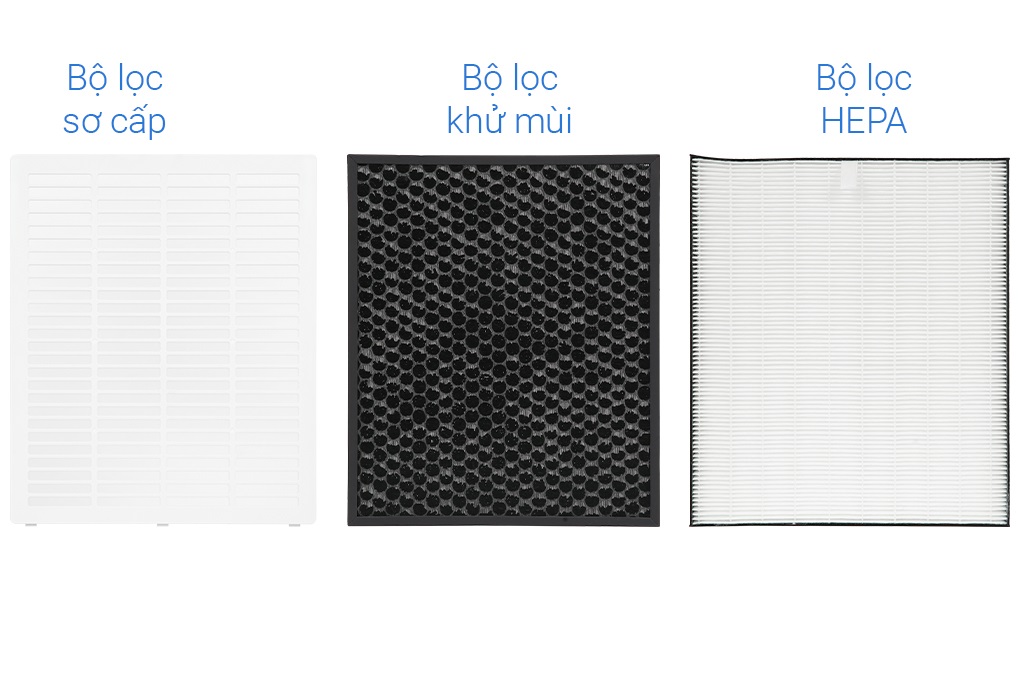 Với bộ lọc qua 3 lớp: tấm lọc bụi thô, tấm lọc khử mùi than hoạt tính và bộ lọc HEPA trên máy lọc không khí giúp lọc được các phần tử bụi có kích thước nhỏ như phấn hoa, bụi mịn giúp hạn chế các tác nhân gây bệnh hô hấp.